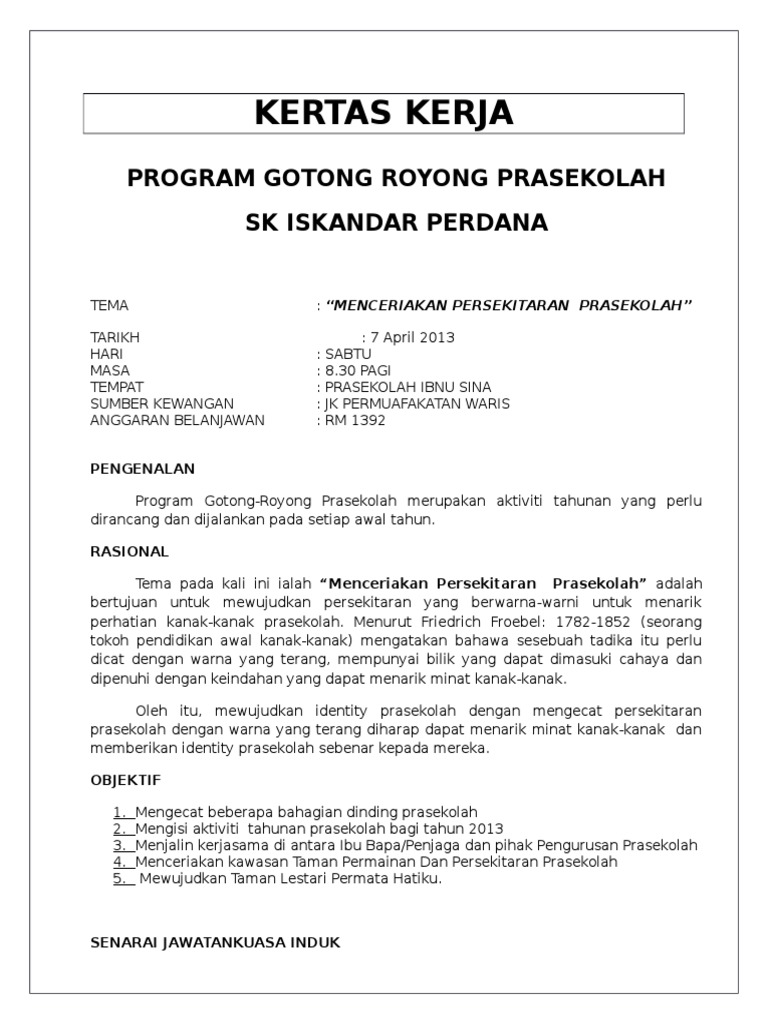 Contoh Kertas Kerja Gotong Royong Prasekolah